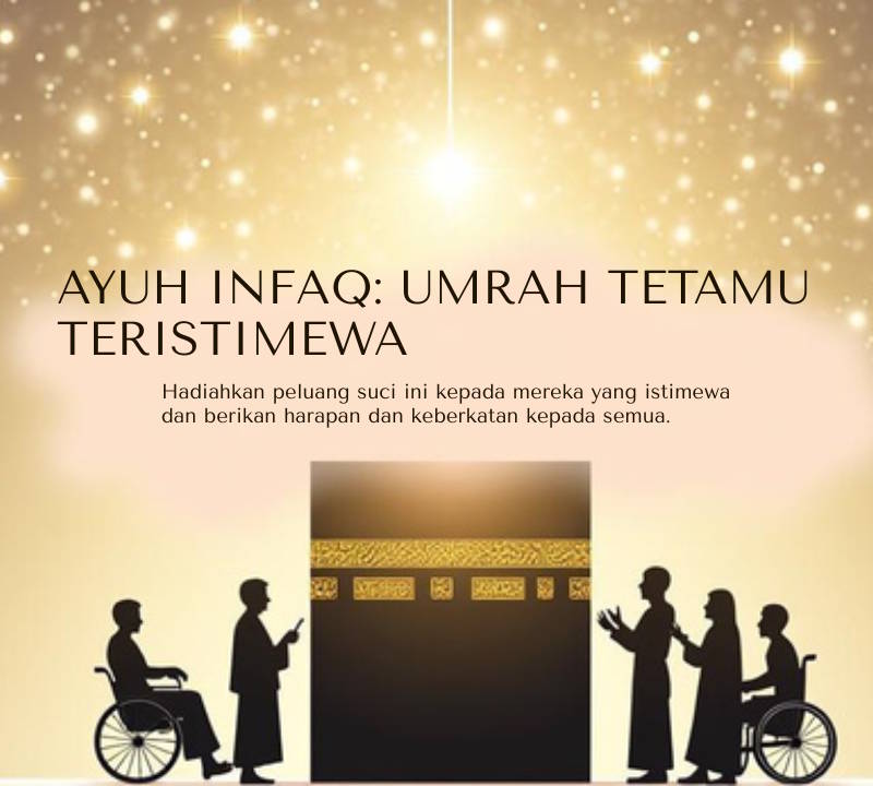 Di Yayasan Tadabbur, kami membuka peluang untuk anda jadikan diri anda asbab terlaksananya impian agung ini. Program Infaq Umrah Tetamu Teristimewa adalah khusus didedikasikan kepada golongan orang berkelainan upaya (OKU), golongan yang kurang berkemampuan serta individu yang diikhtiraf berjasa kepada ummah.Melalui program Umrah tetamu Teristimewa mereka menjadi tetamu teristimewa Allah SWT merasai kemanisan munajat ibadah umrah dan bertawaf di Baitullah yang selama ini hanya mampu diimpikan.